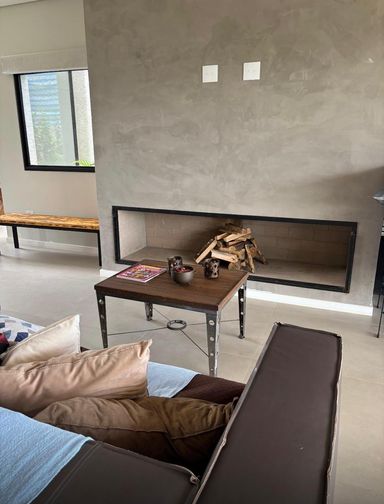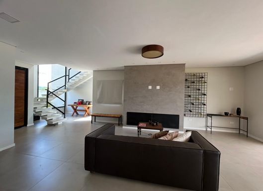 Na área social, os ambientes foram pensados para integração e convivência. A casa dispõe de sala de estar, sala de jantar e sala de TV, criando espaços perfeitos para receber convidados ou aproveitar momentos em família. A presença de uma lareira torna o ambiente ainda mais aconchegante, especialmente nos dias mais frios.